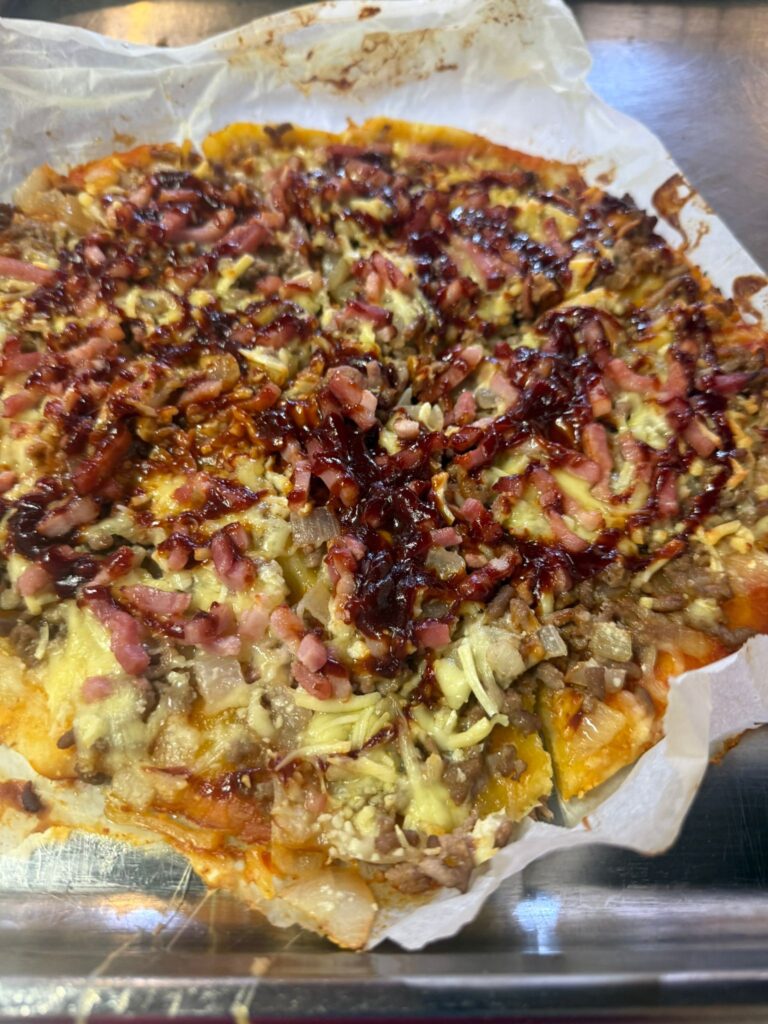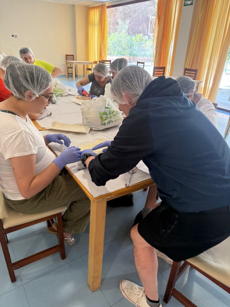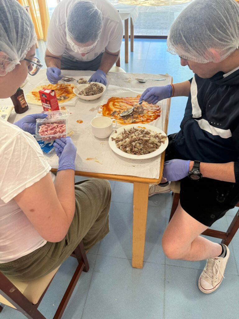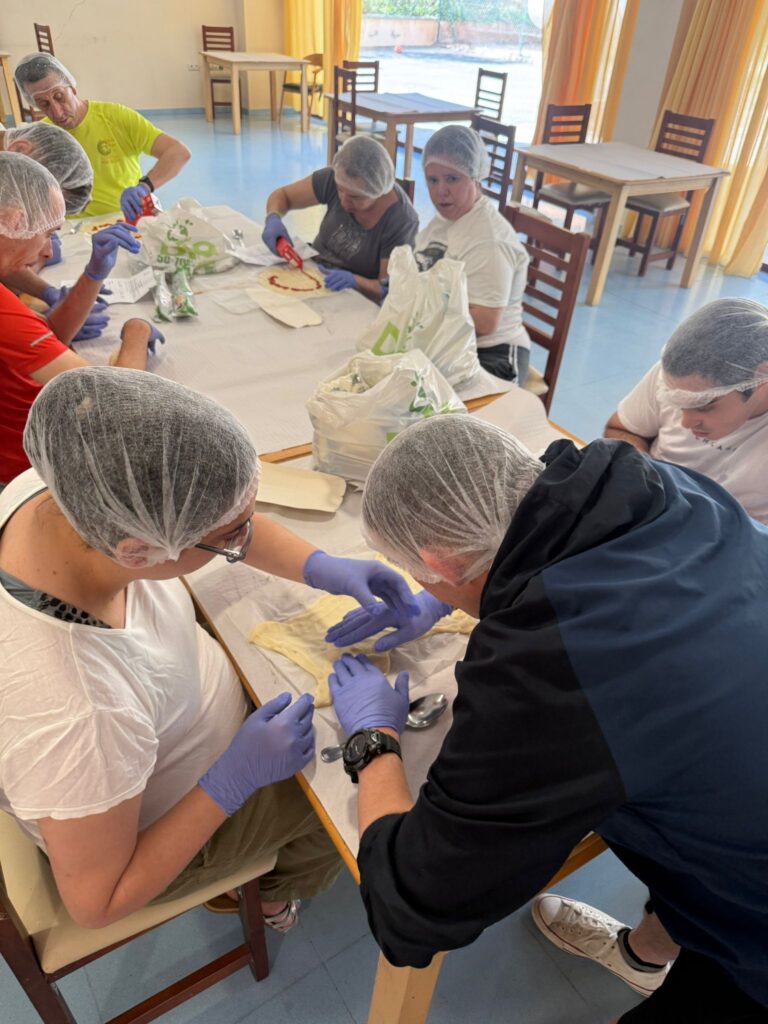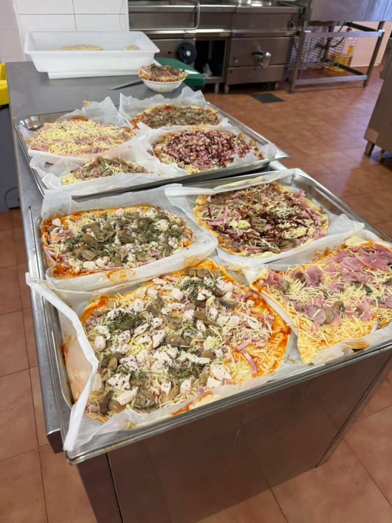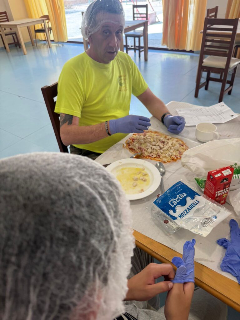 Finalmente hicimos unas pizzas que estuvieron para chuparse los dedos. Nos pusimos guantes en mano, y gorro en cabeza, e hicimos por grupos las pizzas con los ingredientes que habíamos comprado.