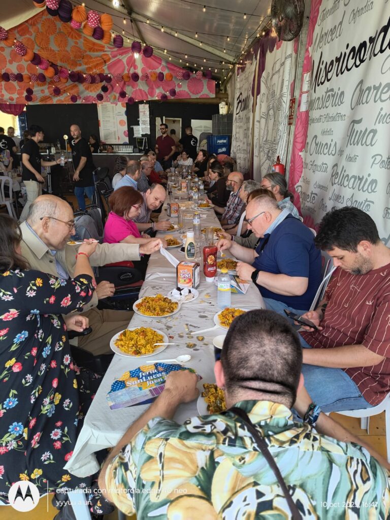 Después de tomar el correspondiente vino con barquillo nos dirigimos a almorzar. Como todos los años pudimos comer migas, paella y pescaíto frito en la Caseta de la Hermandad de los Estudiantes.