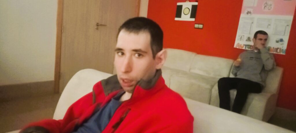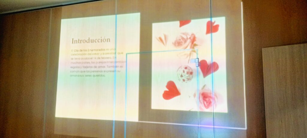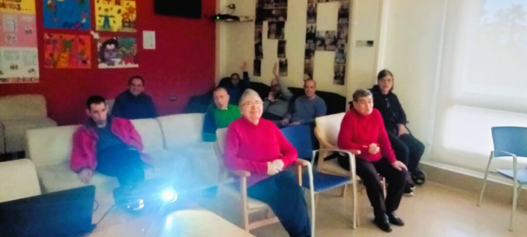 Los usuarios/as de la residencia Virgen de la Cabeza de Entrepinares del Mercadillo se reúnen para asistir a un taller audiovisual mediante diapositivas sobre el día de san Valentín. El taller consiste en ver una presentación de imágenes que ilustran el amor en sus diversas formas y expresiones.