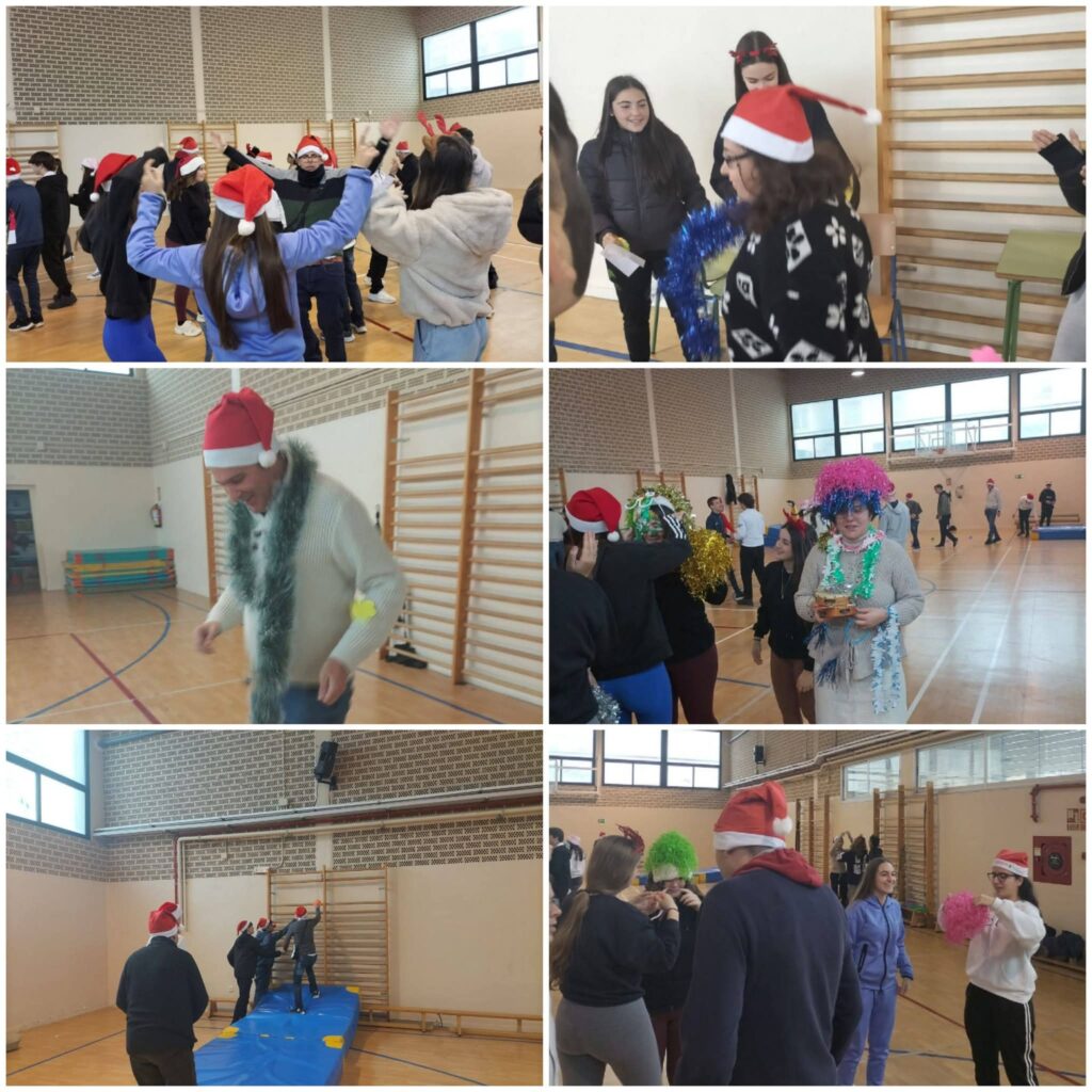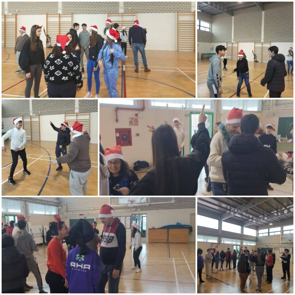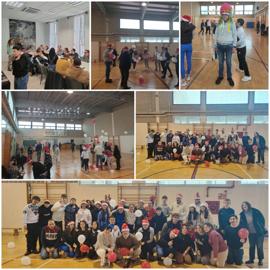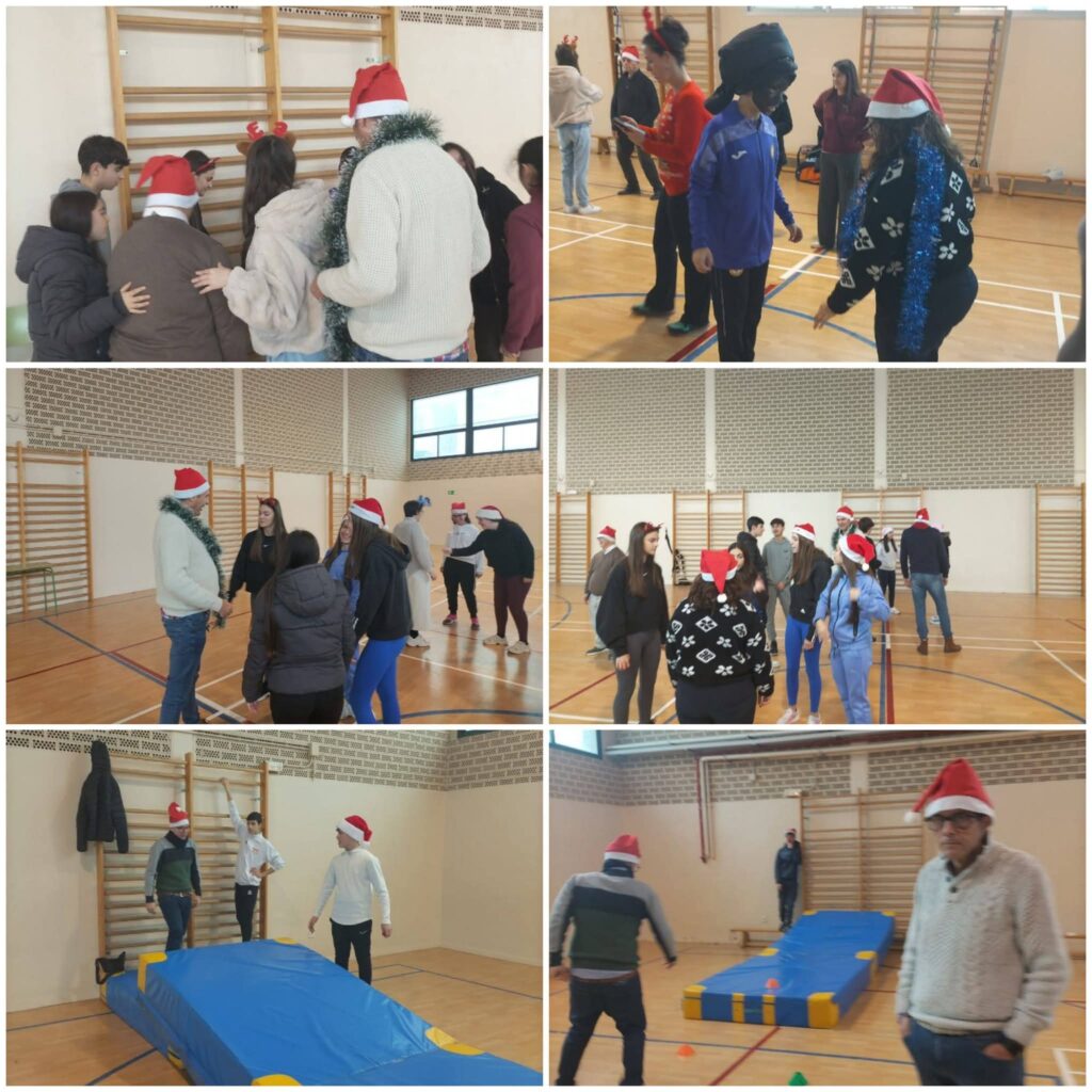 Tras sus actuaciones, nos unimos y nos organizaron una gymkana con varias estaciones donde plasmaron las actividades que saben que más nos gustan y que disfrutamos: un circuito con colchonetas, una de baile, otra de decoración navideña… y para finalizar, bailamos todos/as juntos/as una coreografía que nos animaba a mover el esqueleto.