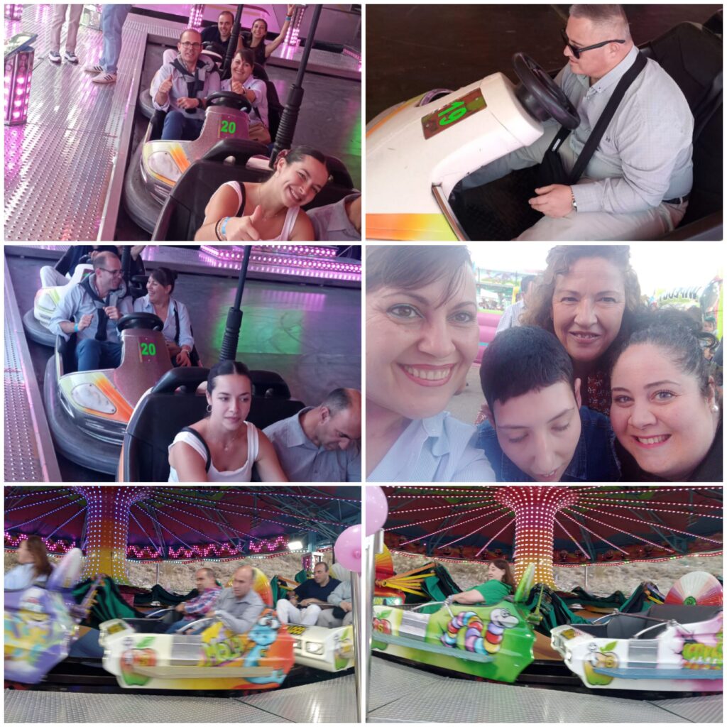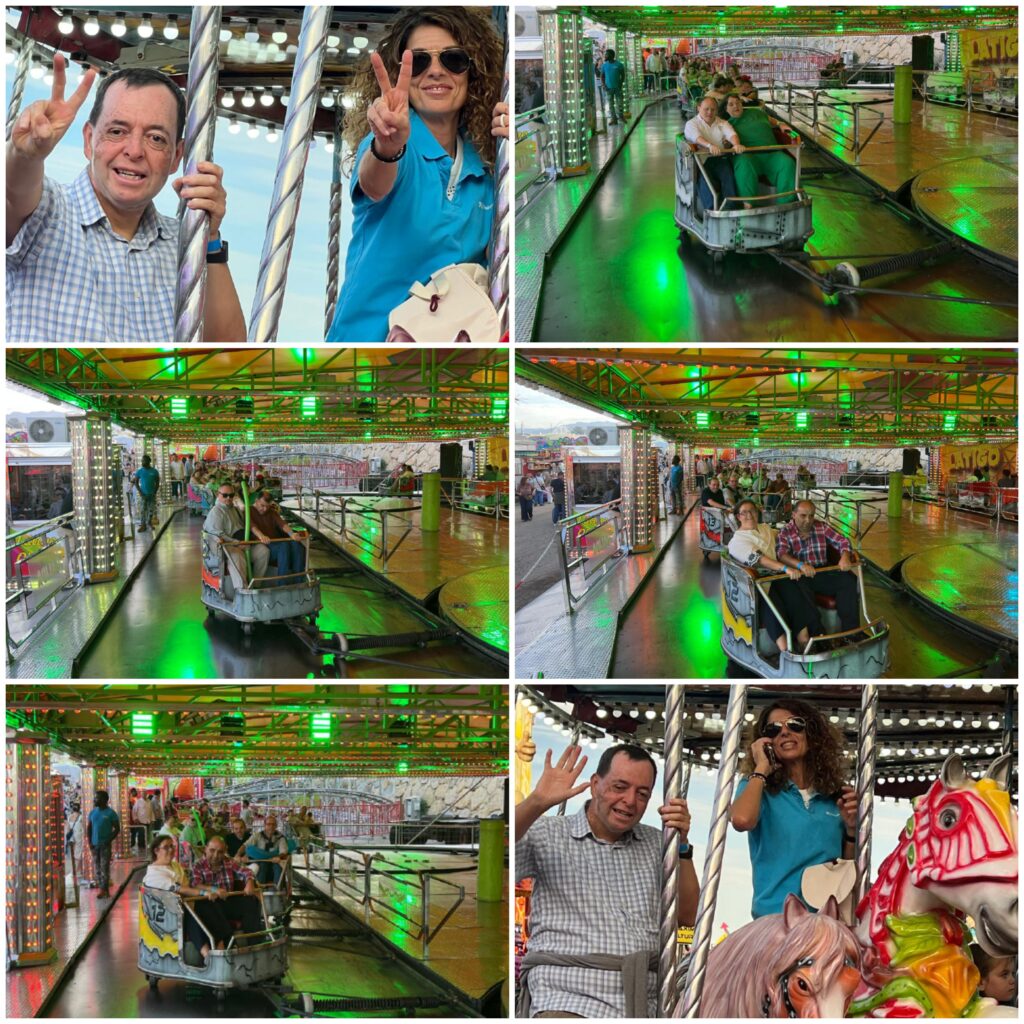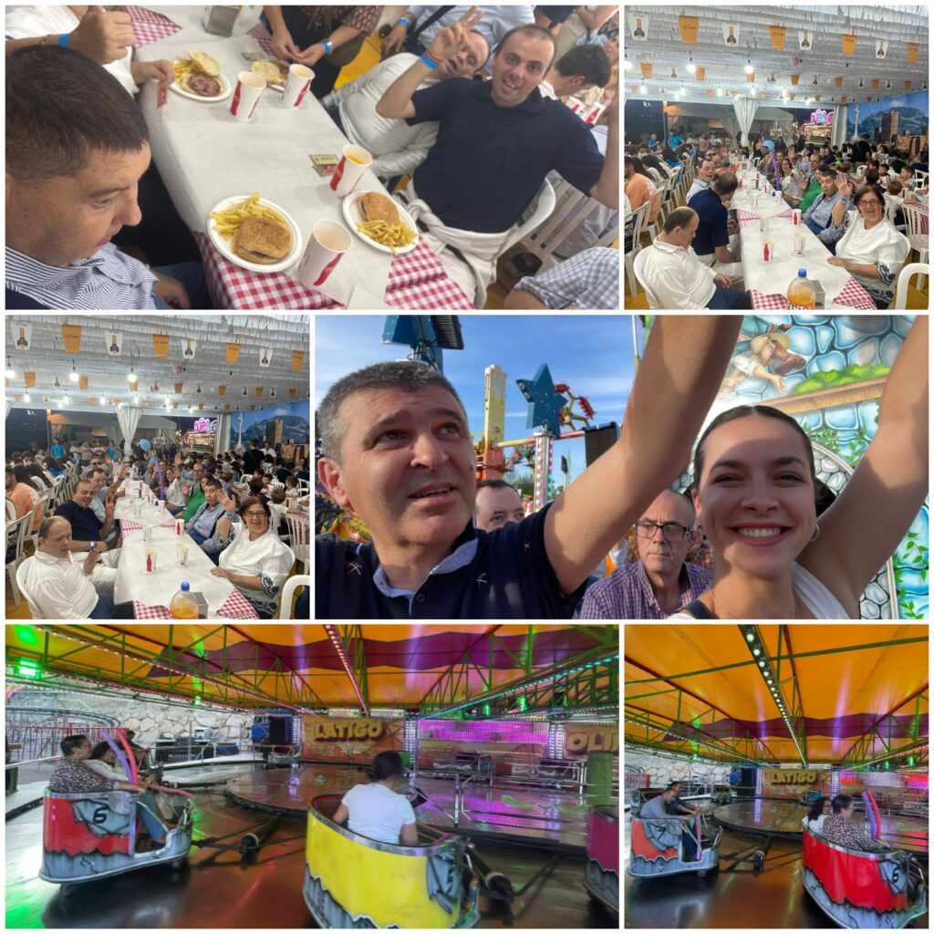 Nos hemos montado a placer en las atracciones y nos partimos de risa en los “Coches Locos”, “El tren de la Bruja”, “El Látigo”, “El gusano loco”, el Sapito, los caballitos… Para cerrar con broche de oro, nos hemos puesto hasta arriba de hamburguesas, perritos y refrescos, en la caseta de Santa Ana. Después, unos vinitos típicos sin alcohol, en Casa Vargas.