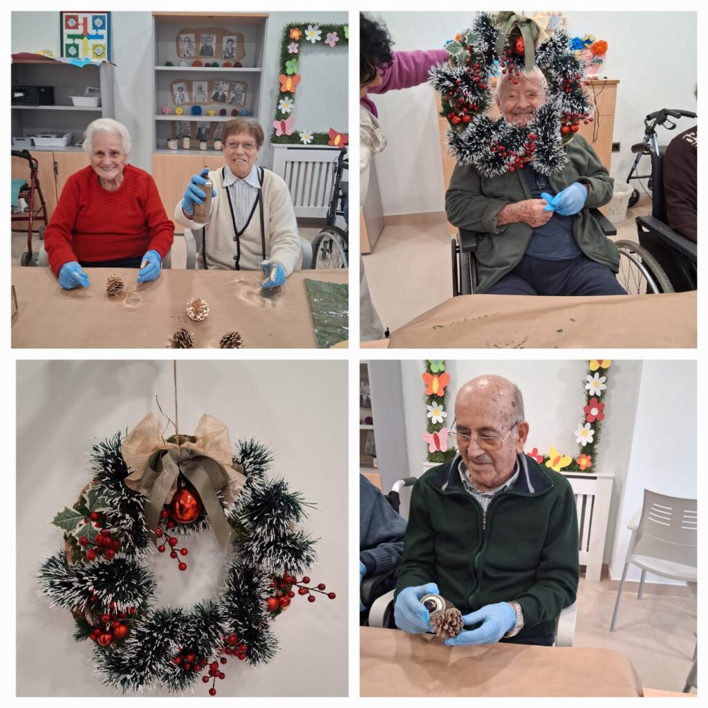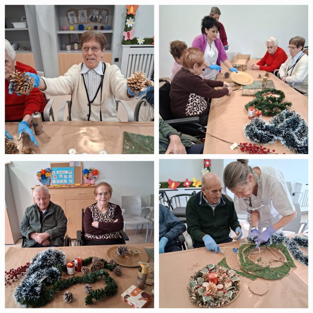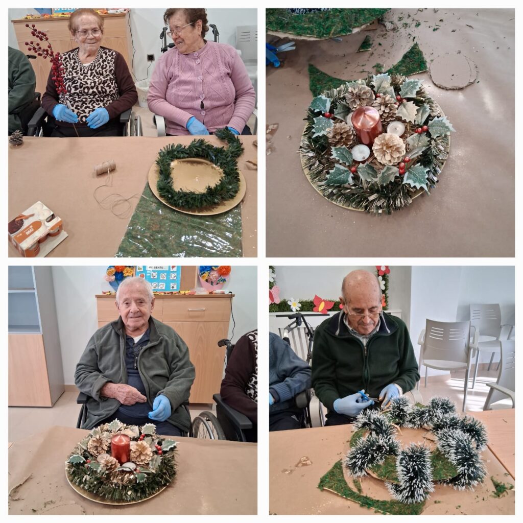 Los/as usuarios de la Residencia de Mayores María Torres del grupo Entrepinares del Mercadillo han participado hoy en un taller de elaboración de centros de mesa navideños, utilizando materiales naturales y decorativos para crear sus propios diseños.