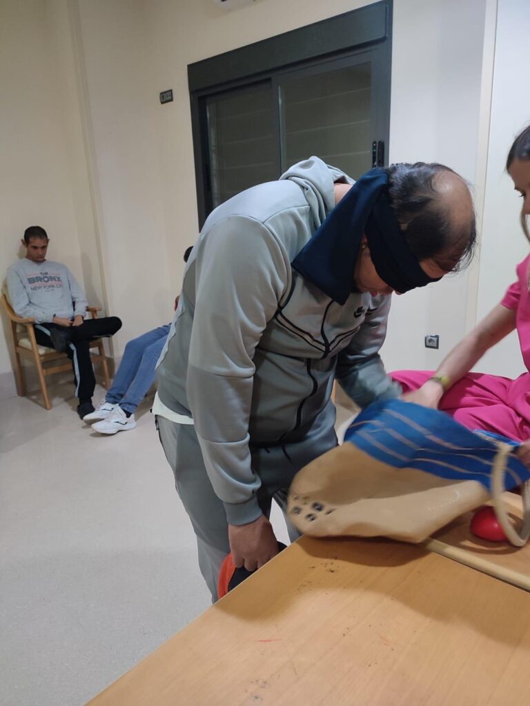 Hemos metido en una bolsa varios objetos misteriosos. Nuestros/as residentes, por turnos, se acercaban para taparse los ojos y coger un objeto. Su misión ha sido averiguar de qué objeto se trataba a través únicamente del sentido del tacto.