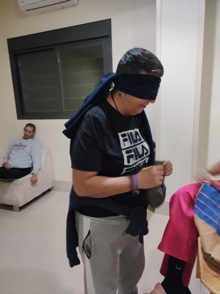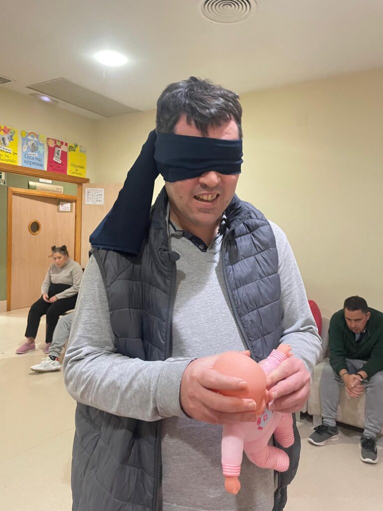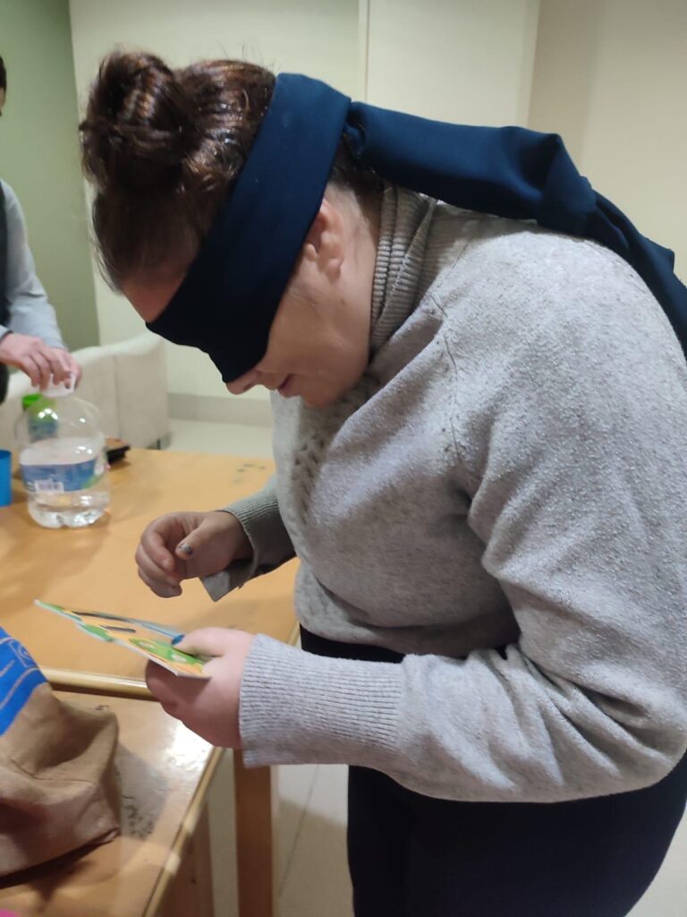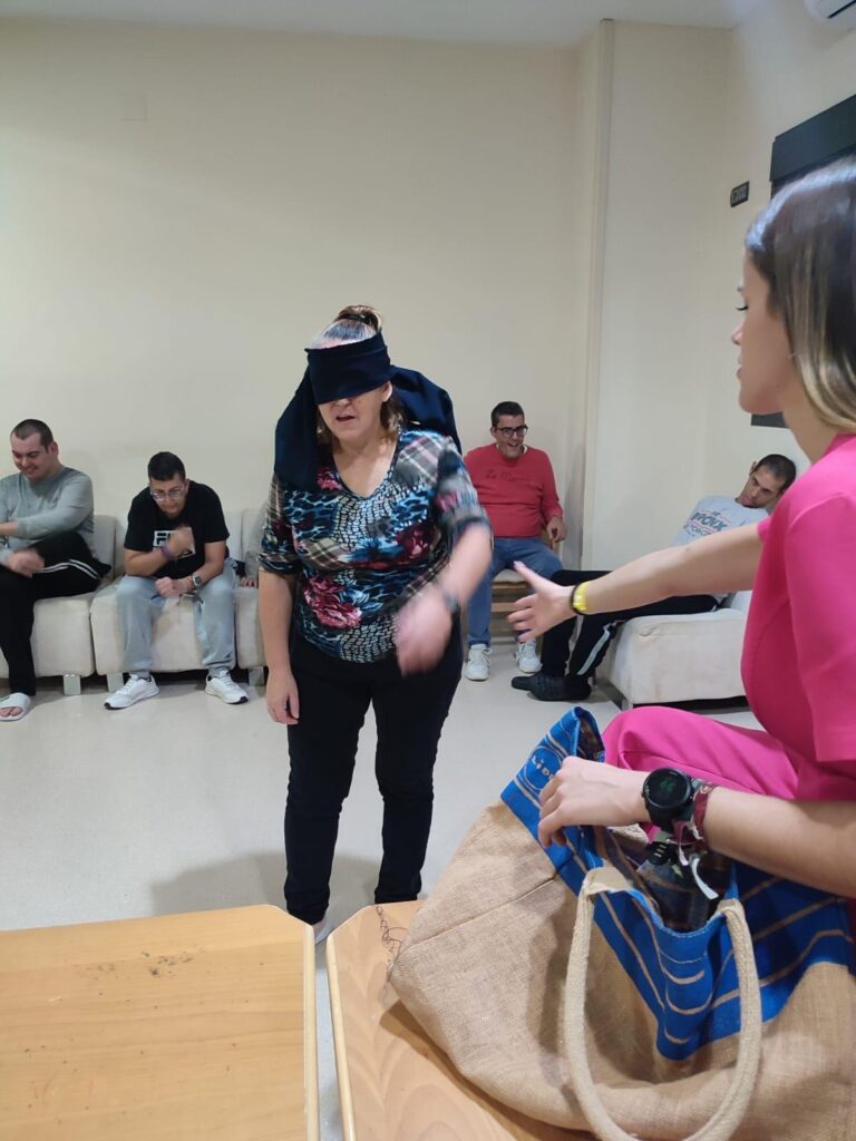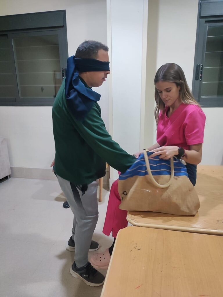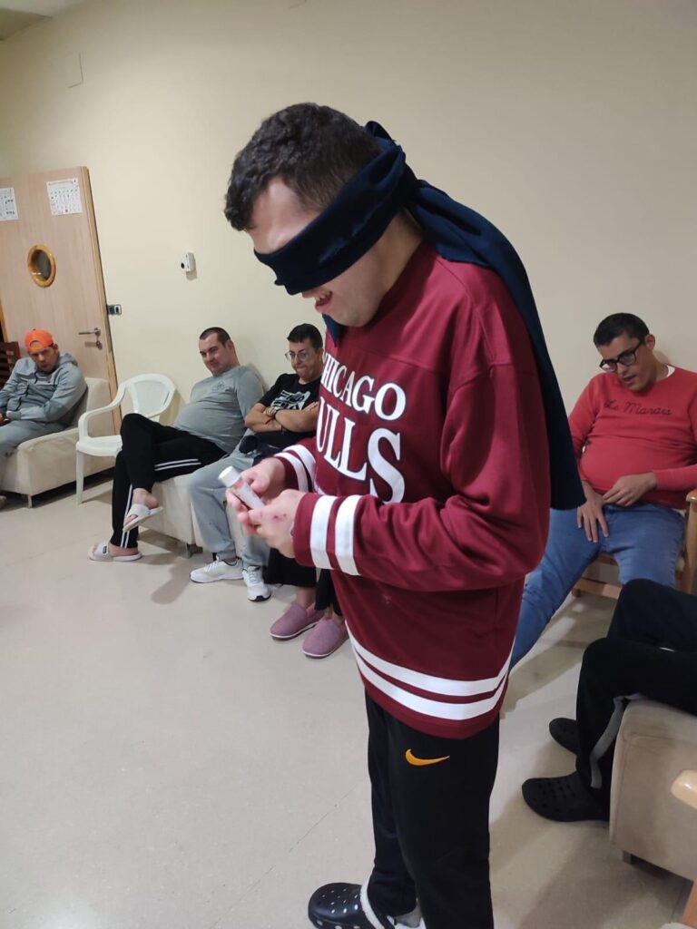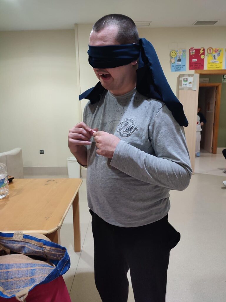 Hemos metido en una bolsa varios objetos misteriosos. Nuestros/as residentes, por turnos, se acercaban para taparse los ojos y coger un objeto. Su misión ha sido averiguar de qué objeto se trataba a través únicamente del sentido del tacto.